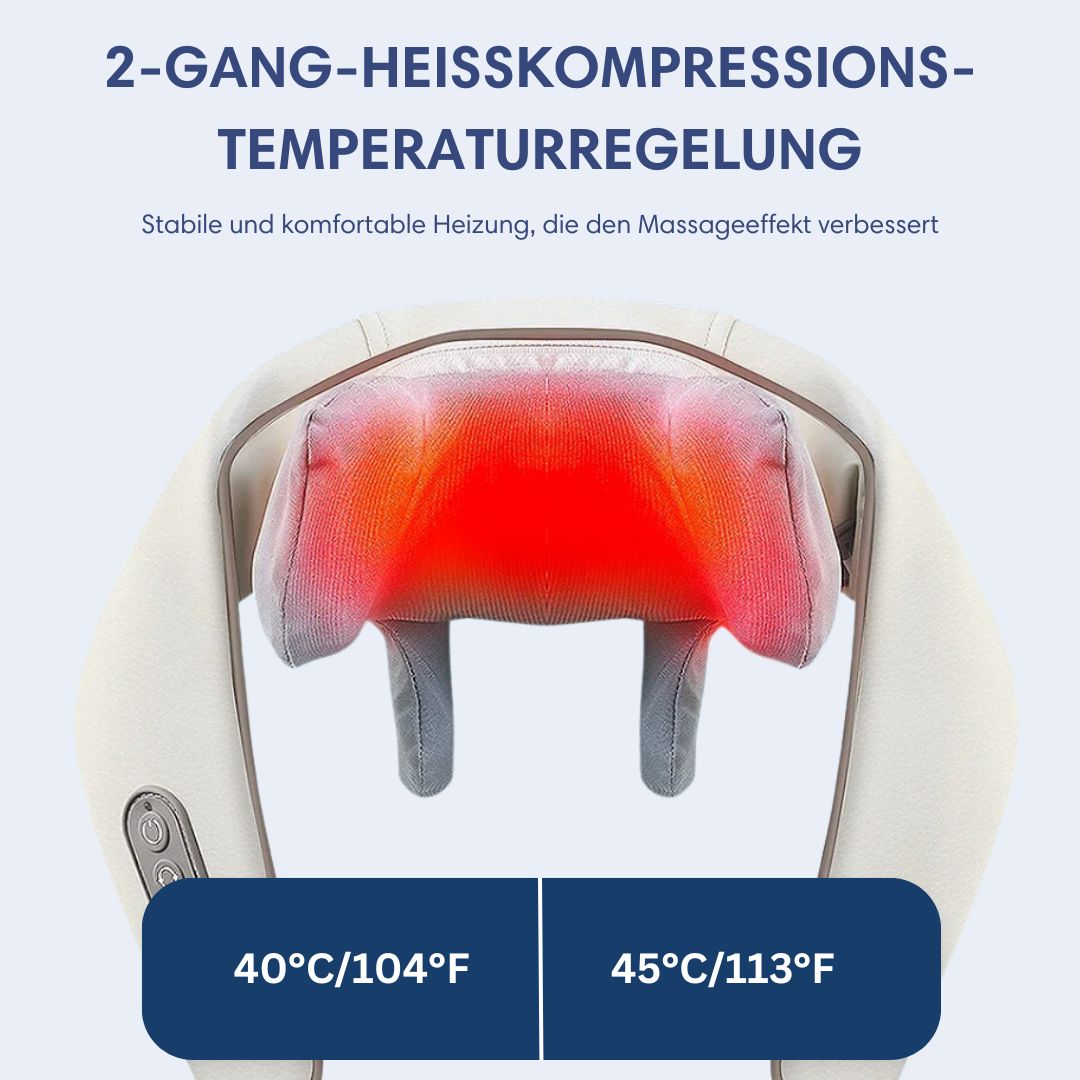 Das Wolkentraum RelaxHeat Nacken- und Rücken-Massagegerät bietet nicht nur eine tiefenwirksame 3D-Massage, sondern auch eine innovative 2-Gang-Heißkompressionstemperaturregelung. Mit wählbaren Einstellungen von 40°C und 45°C, sorgt die Wärme für eine verbesserte Durchblutung und verstärkt die Entspannung der Muskeln. Die stabile und komfortable Heizung intensiviert den Massageeffekt und liefert Ihnen eine wohltuende Kombination aus Tiefenmassage und gezielter Wärmetherapie – entwickelt in Zusammenarbeit mit führenden Physiotherapeuten. Vertrauen Sie auf modernste Technologie für nachhaltige Schmerz- und Verspannungslinderung.